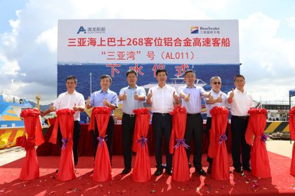 2021年5月27日09:38,中交海投所屬三亞藍(lán)色干線268客位高速客船“三亞灣”號(hào)在澳龍船廠順利下水。中交海投黨委副書(shū)記、總經(jīng)理周濟(jì),九洲控股集團(tuán)副總經(jīng)理、九洲藍(lán)色干線公司黨委書(shū)記、董事長(zhǎng)梁凱斌,澳龍船廠董事長(zhǎng)晏志清出席儀式并致辭。